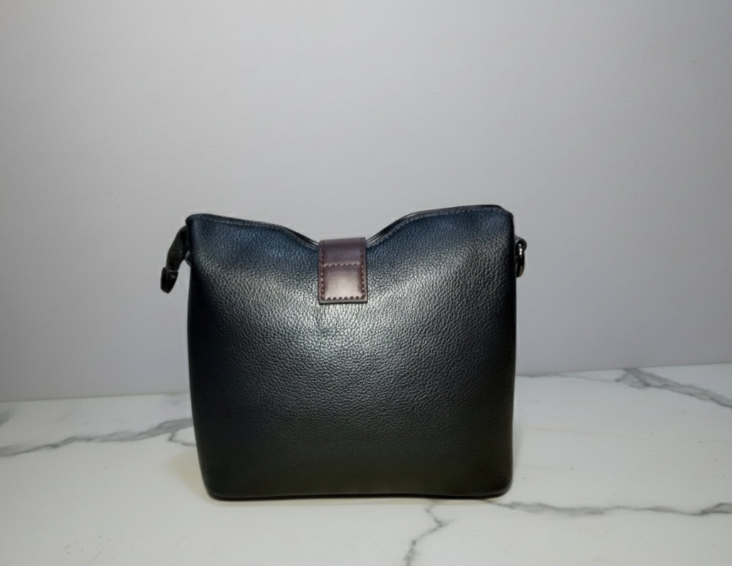 Its sophisticated black pebbled-texture body is contrasted by a stunning, vertical duo-tone metallic accent, adding a contemporary edge that catches the eye. Whether you're heading to the office, running errands, or enjoying a night out, the Verve bag is your perfect companion.